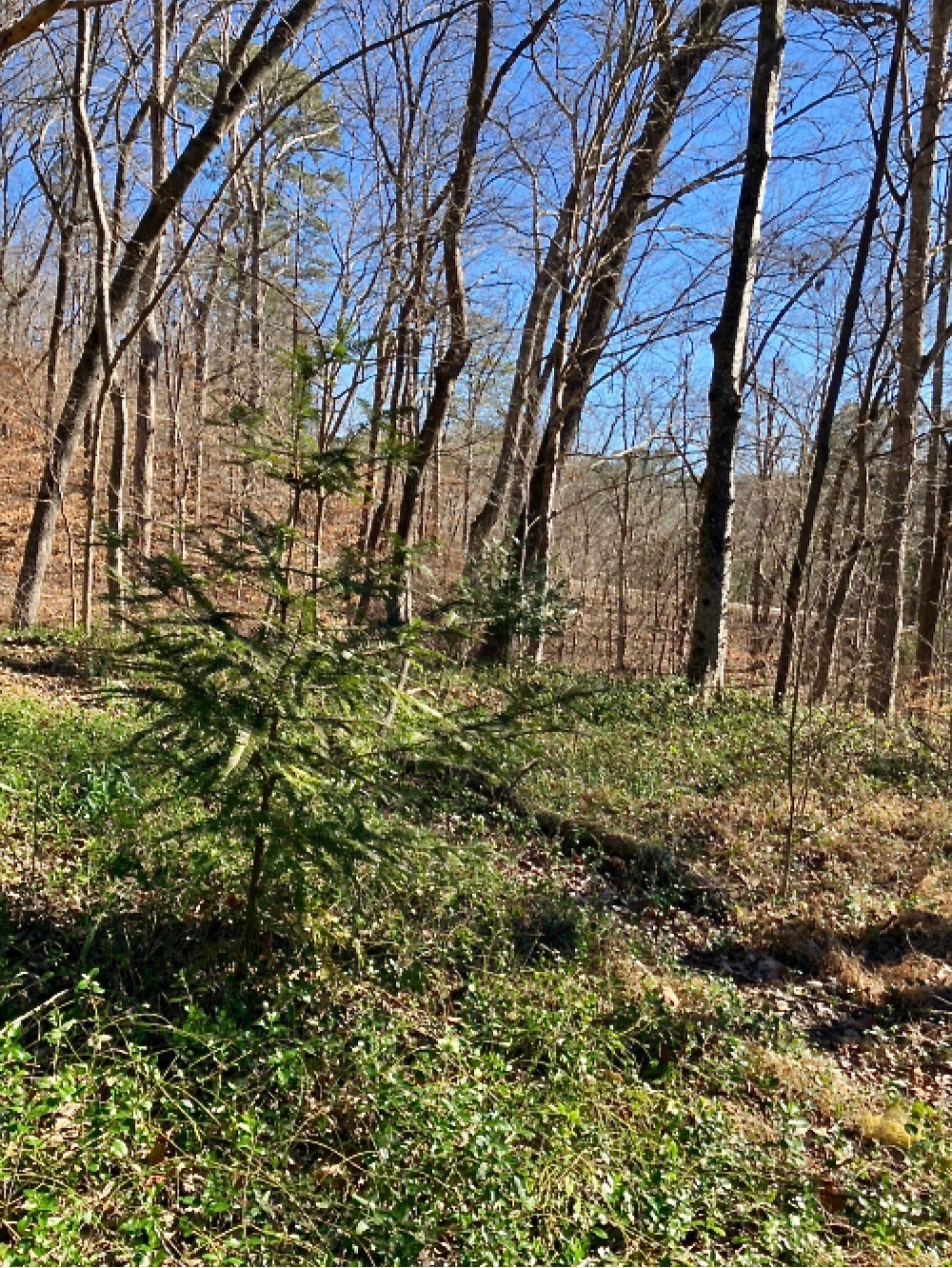 BELOW: The two torreyas under hardwood canopy in November 2025 are surrounded by an evergreen invasive periwinkle.