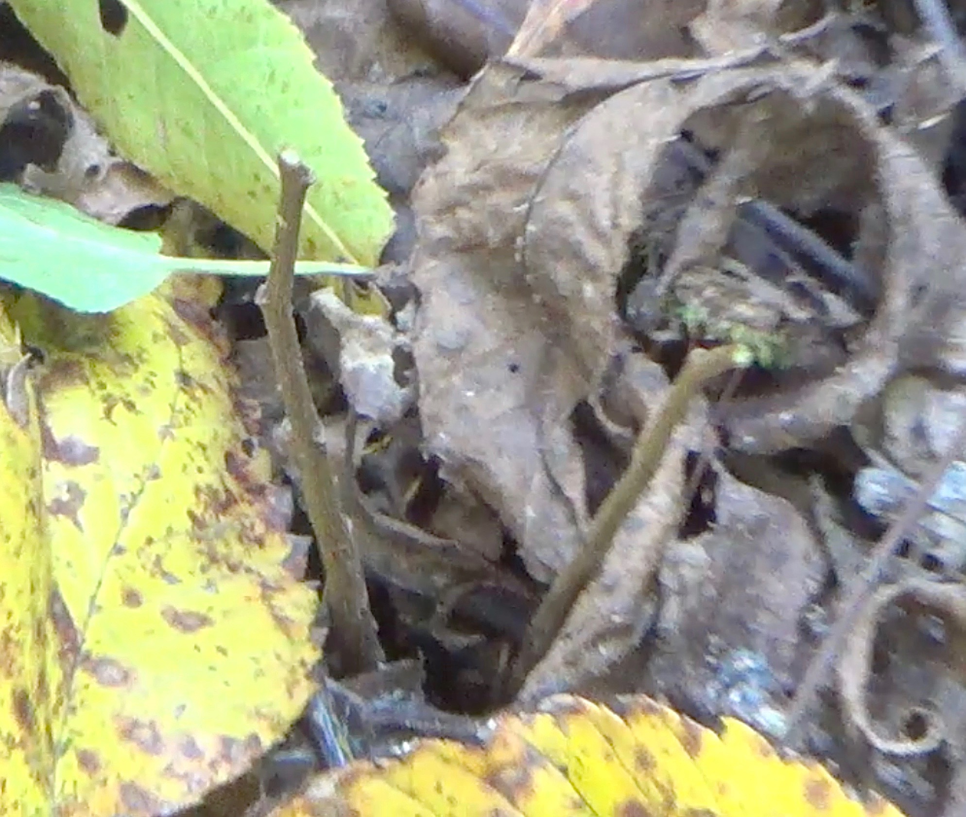 ABOVE: Close-up views of the rightmost seedling, showing prior herbivory once or twice. Logic would suggest that if the stem is snipped late in the summer or into the fall, then sufficient photosynthates would reside in the roots to push out new growth the following spring. But if the leaves vanish soon after unfurling, the fates might be less generous.