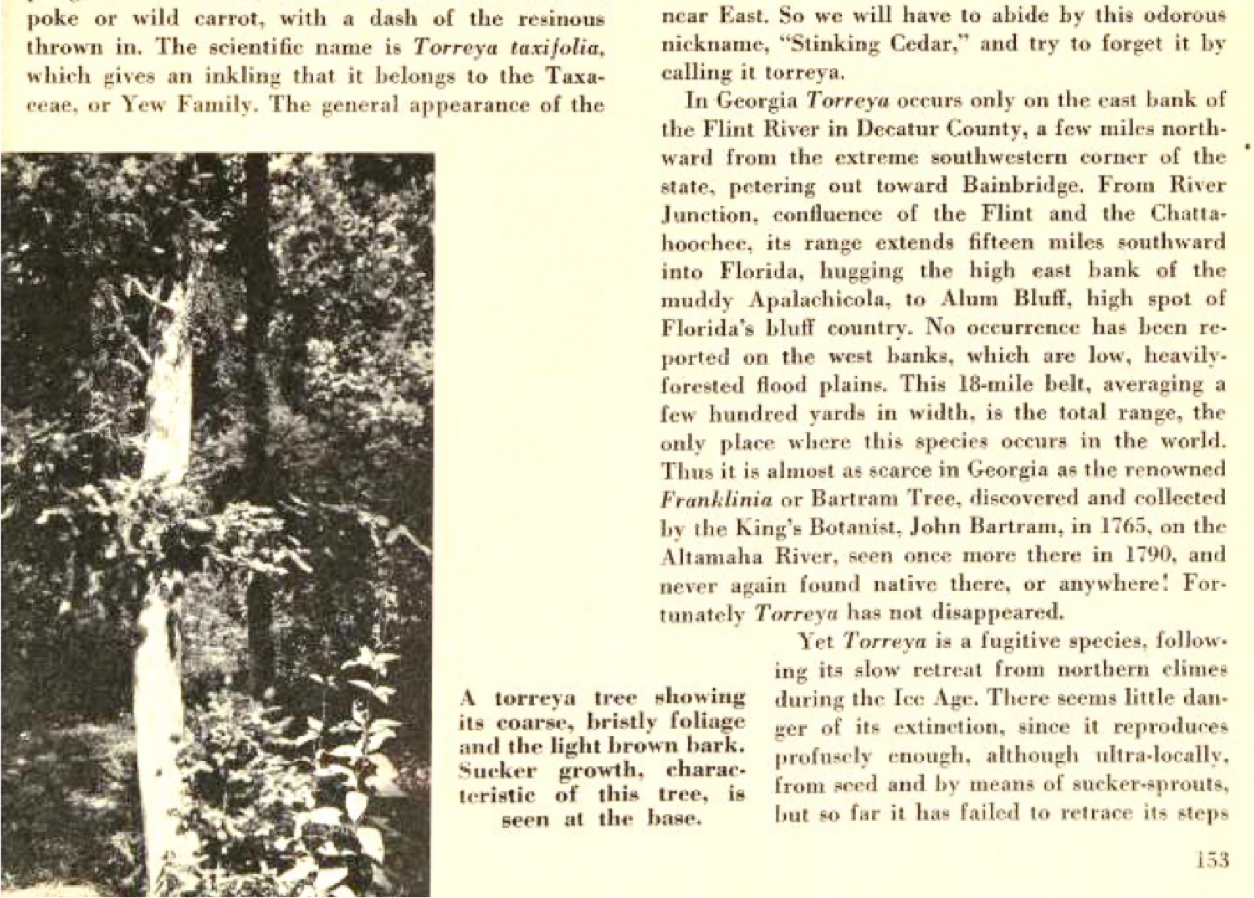 In 2026 Paul Camire, a Torreya Guardian in Michigan, discovered this archived article online. Expanded images of the article are shown at bottom. But first, I excerpt almost all of the article and add bold (and color) to draw attention to key points. Much of the excerpted text also appears on these additional pages on the Torreya Guardians website, as it offers crucial historical, cultural, and ecological understandings of this endangered tree that are not available in any academic publications:Reports by Volunteers • Natural History of Florida Torreya • Learnings EXCERPT: ... In Georgia Torreya occurs only on the east bank of the Flint River in Decatur County, a few miles northward from the extreme southwestern corner of the state, petering out toward Bainbridge. From River Junction, confluence of the Flint and the Chattahoochee [the Woodruff Dam was constructed at the confluence in 1956], its range extends fifteen miles southward into Florida, hugging the high east bank of the muddy Apalachicola, to Alum Bluff, high spot of Florida's bluff country. No occurence has been reported on the west banks, which are low, heavily-forested flood plains. This 18-mile belt, averaging a few hundred yards in width, is the total range, the only place where this species occurs in the world. Thus it is almost as scarce in Georgia as the renowned Franklinia or Bartram Tree, discovered and collected by the King's Botanist, John Bartram, in 1765, on the Altamaha River, seen once more there in 1790, and never again found native there, or anywhere! Fortunately, Torreya has not disappeared.