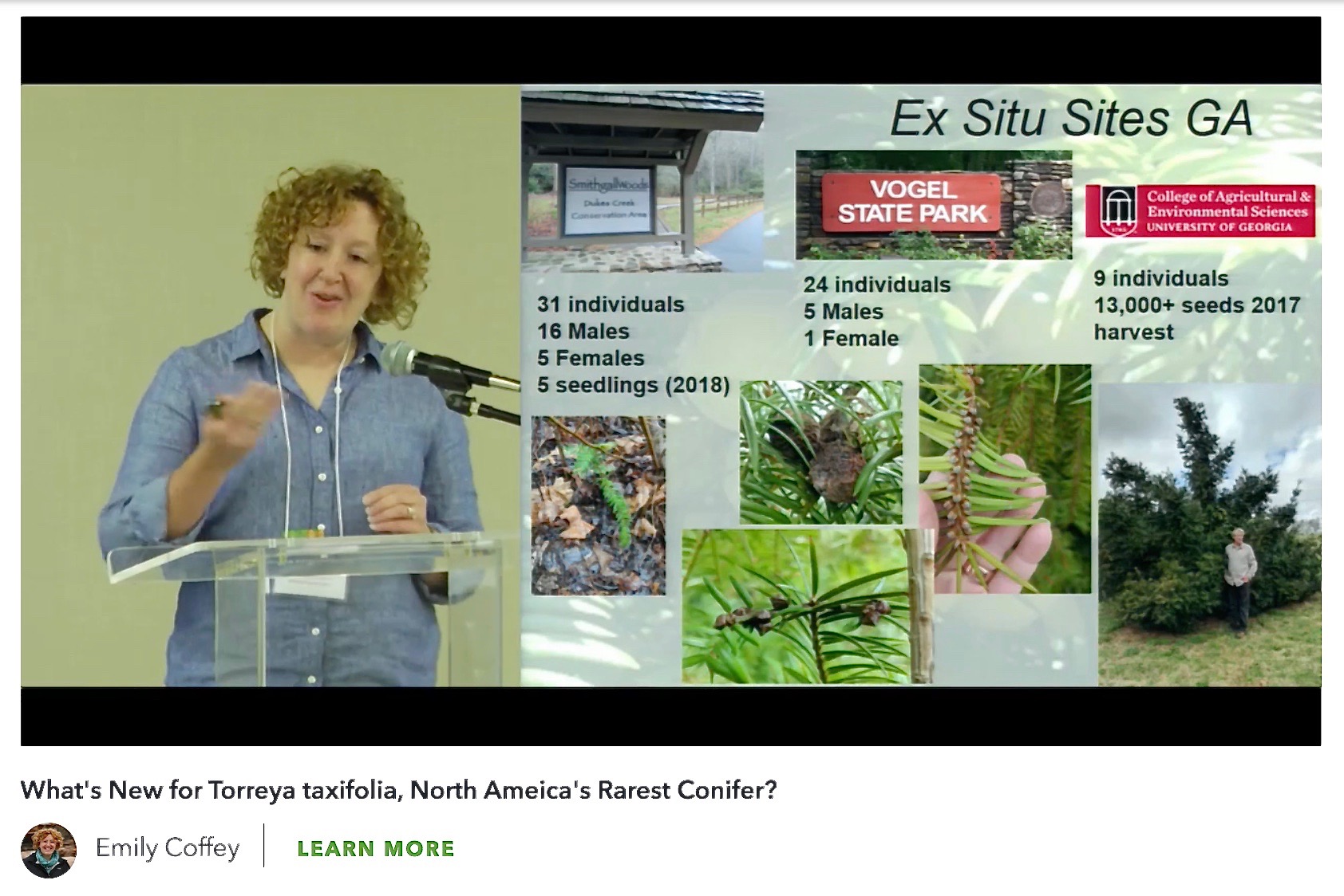 Our group has been asked by Atlanta Botanical Garden (ABG) not to include any of their web postings on our website. We do, however, briefly list and link all Torreya-related resources (posted by any agency or institution) on our Efforts to Save Torreya taxifolia webpage. This 2018 talk by an ABG staff person is also listed on that page. However, because this video presents crucial data on in situ and ex situ seed production, visual and spoken-word excerpts are included here, with no annotation or comment.