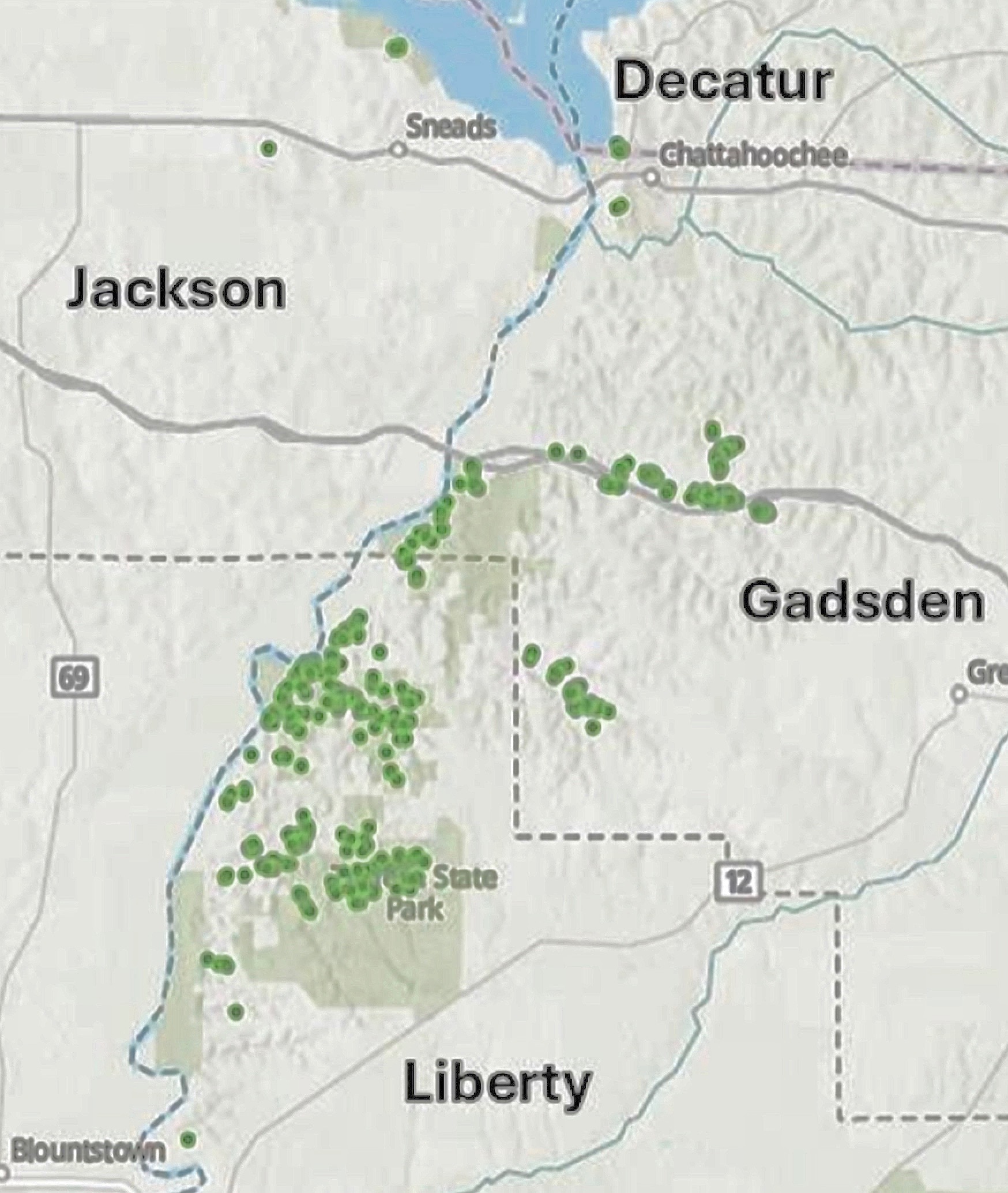 The topographically rich and forested land in this region of northern Florida contains the same kinds of "steephead ravines", with small creeks at their bottoms, that provides crucial habitat in the original relictual range eastward in the panhandle. |