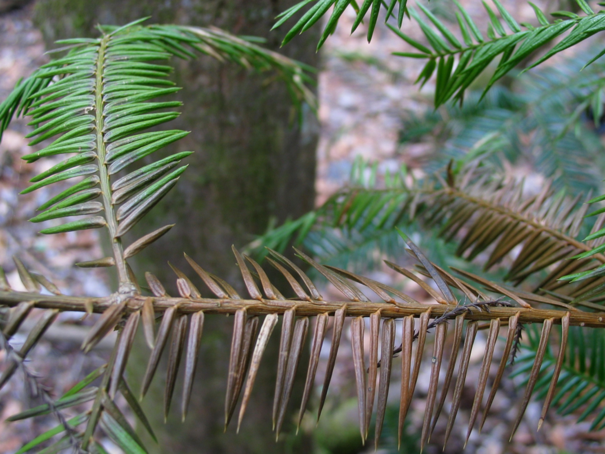 Barlow adds: This is a helpful paper. My own natural history observations in 2005 (at a greater number and diversity of sites than the quantitatively driven experimental approach undertaken by Schwartz and Hermann) would add two interpretations: (1) Genus Torreya evolved as a definitive sub-canopy species (as are other members of the yew family); presumably with the assistance of mycorrhizae it is capable of living a very long time in a seemingly stunted state, until a canopy opening enables growth and also seed production on the individual branches that can access sufficient sunlight. (2) With the rare exception of the immense Torreya trees found along Swanton Creek north of Santa Cruz (which is artificial, given that the canopy redwoods were removed in the early 20th century, thus artificially releasing a population of subcanopy Torreyas to grow tall and to seed), Torreya seems to do best on extremely steep slopes, where the usual canopy giants (Coast Redwoods and Douglas-fir) are not found.