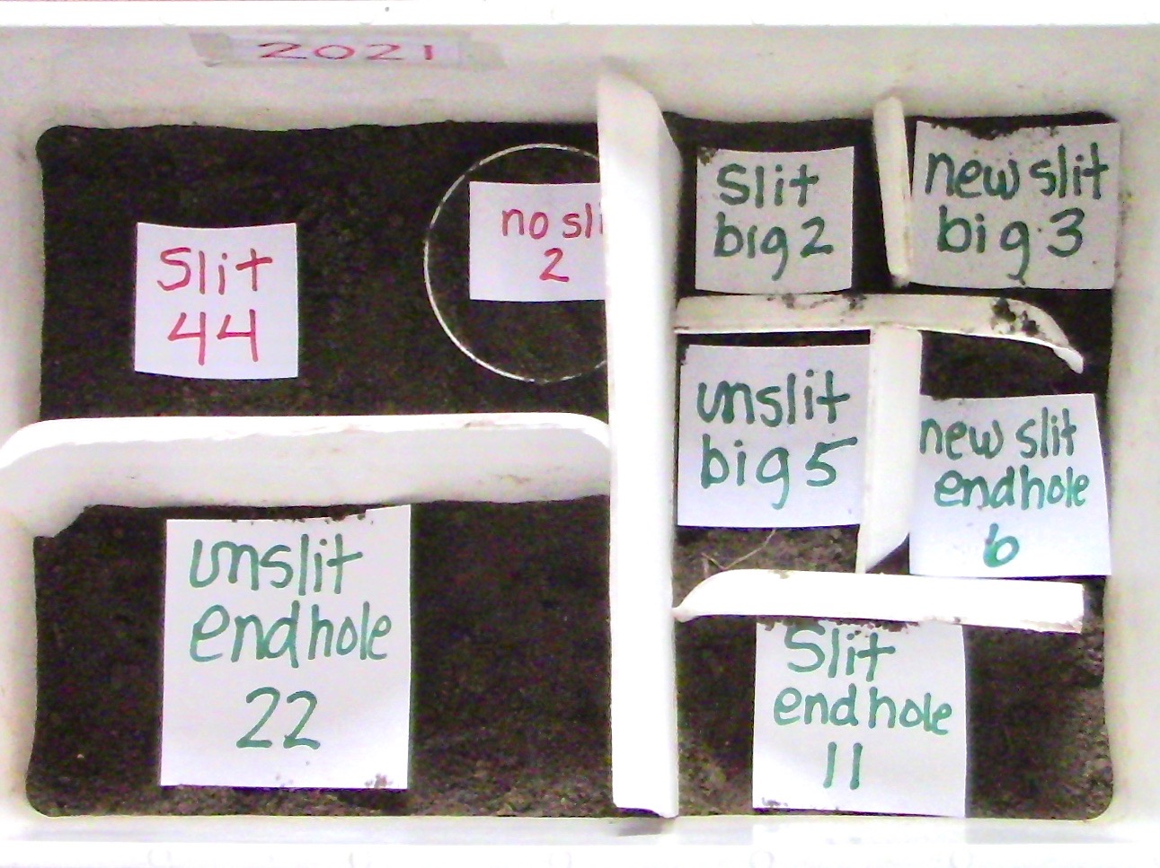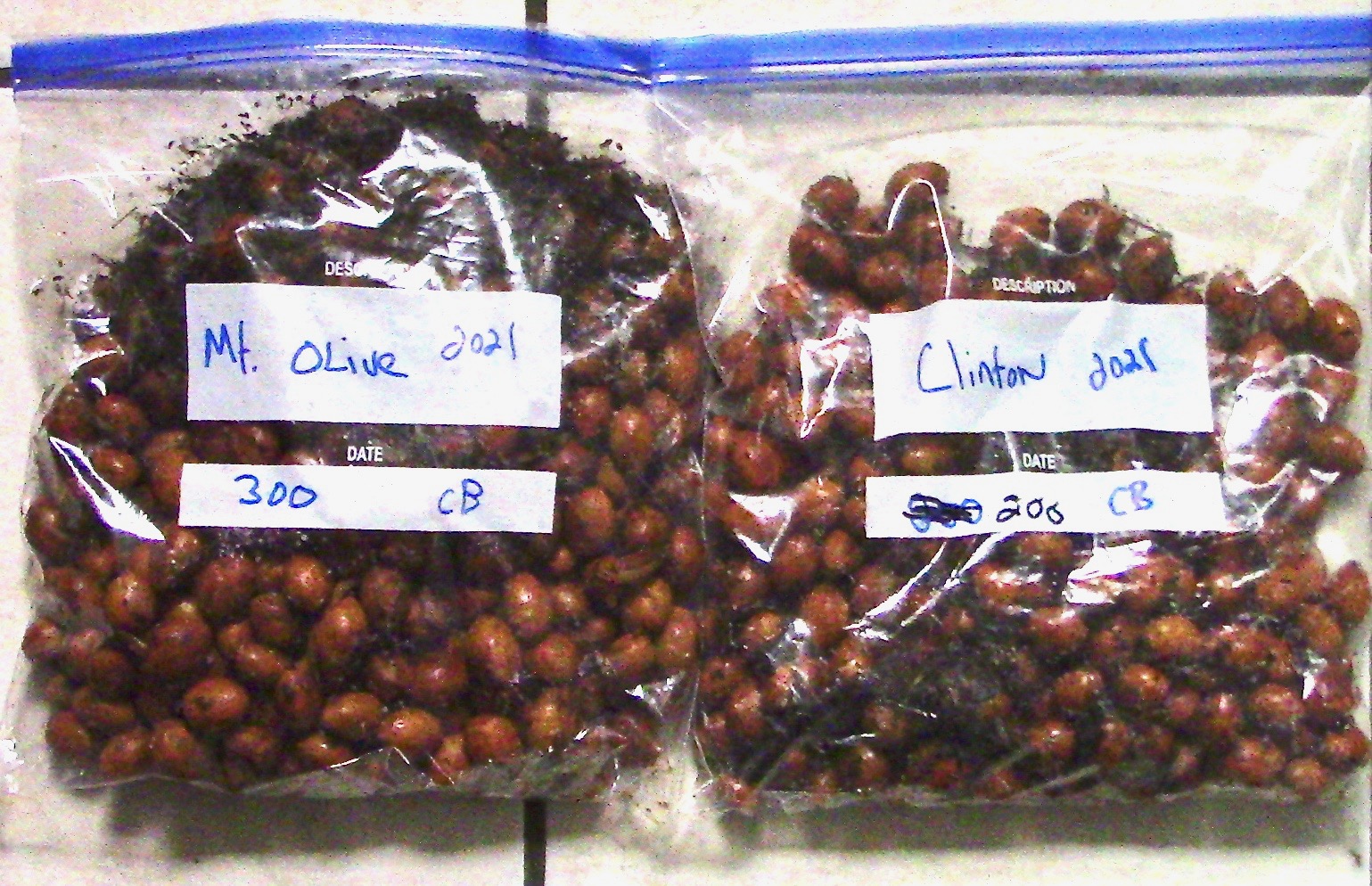 There she planted 59 of the 2022 North Carolina (Clinton) seed harvest that looked perfect, except for circular, dark indentations on the round end (opposite of the pointy end) of the seeds.