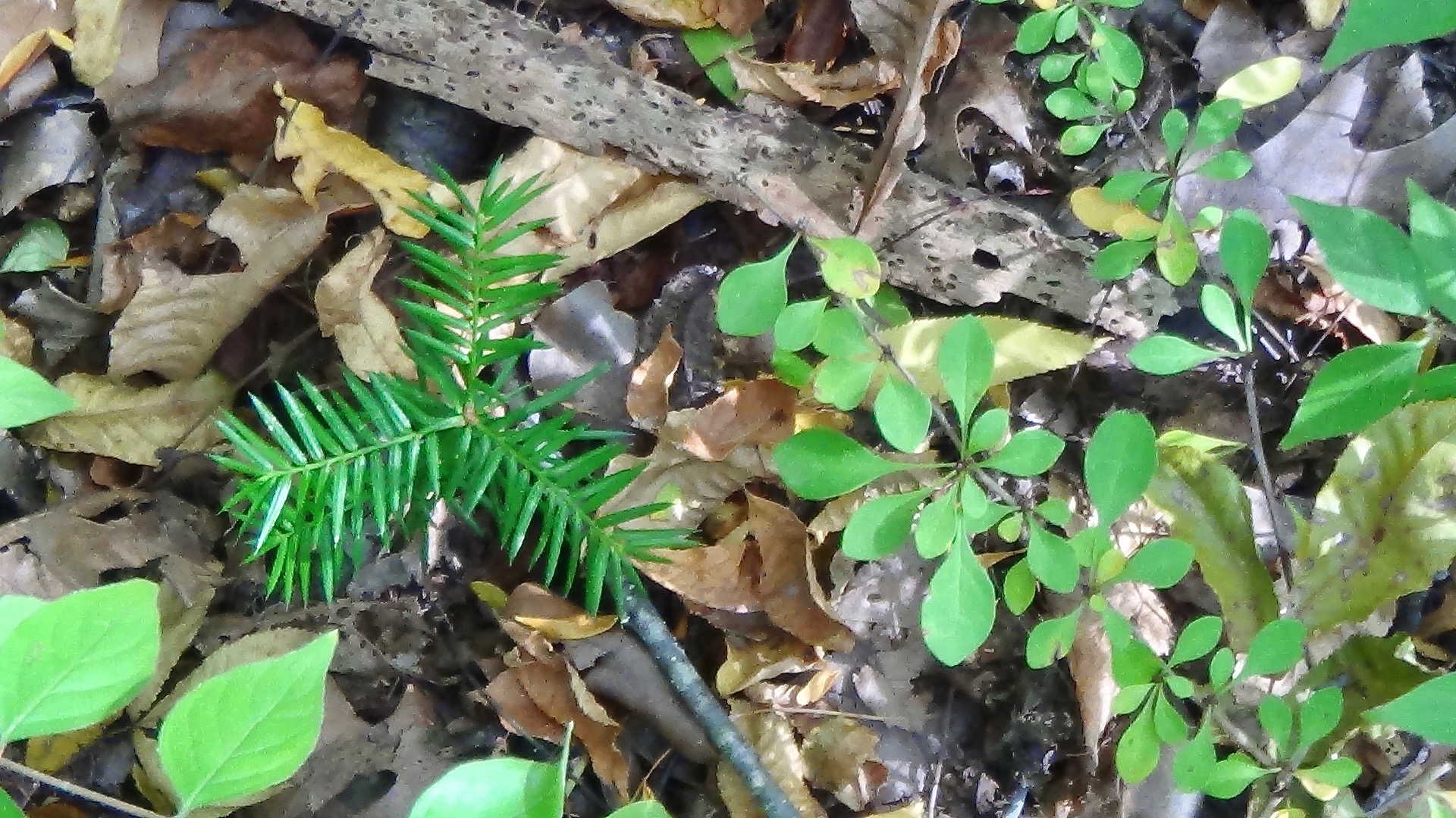 November 2021, Connie chanced upon a thrilling discovery. Although she judged the downtown, steep slopes of the Huron River to be deer-free, she had no proof. So it would still be risky to free-plant torreya seeds there. Surprisingly strong evidence appeared when she began to free-plant torreya seeds, 4 to 6 inches deep, on the high, steep slope across the river from the floodplain park. There it was: a single volunteer yew plant in perfect form, unbrowsed by deer.