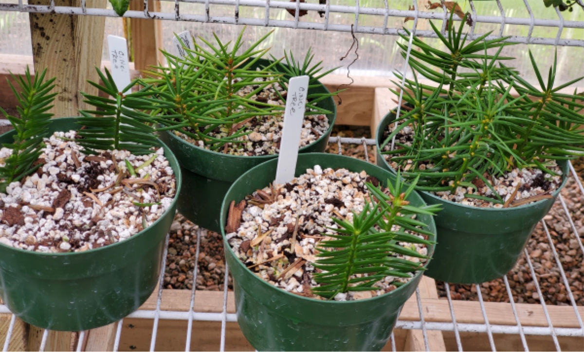 CUTTINGS ROOTING: Update on the Torreya cuttings taken in December. Of the six pots I took, these remain: 4 cuttings from the Cincinnati tree and 11 from my two female trees. None of the cuttings I took from the male trees here survived. Not sure what happened. I've yet to try to see if they are rooting (scared to disrupt things by looking). PHOTOS BELOW are of potted cuttings [in Fred's greenhouse]. Notice the fresh YELLOW BUDS prolific on one of the female cuttings.