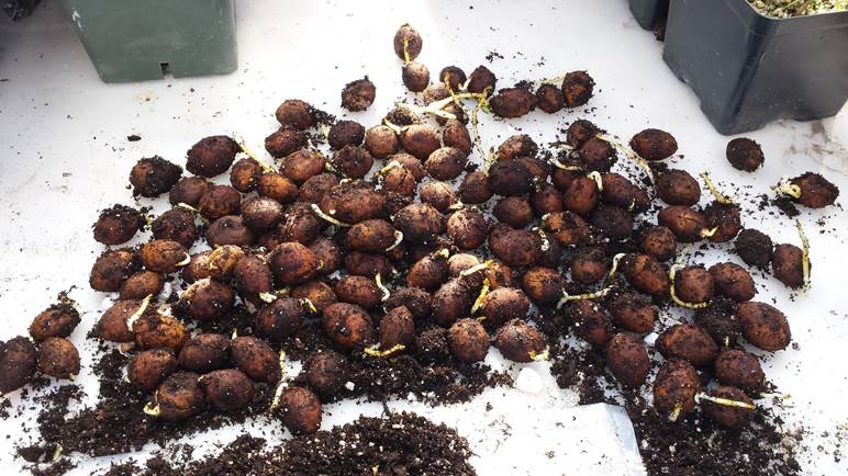 "When they arrived I put them into a 1-gallon ziplock bag with about 4 cups of slightly damp peat/soil mixture and placed it under the bench in my greenhouse (temperature rarely dips below freezing there). "I checked the bag beginning Spring 2015 weekly and removed any that germinated, then resealed the bag and placed it back under the bench. "I hadn't looked at the bag since about Thanksgiving 2015. To my surprise, today (February 6, 2016) I found that all but 13 of the rest of the seeds have germinated. Most are just showing the radicle; a few have sprouted significantly."