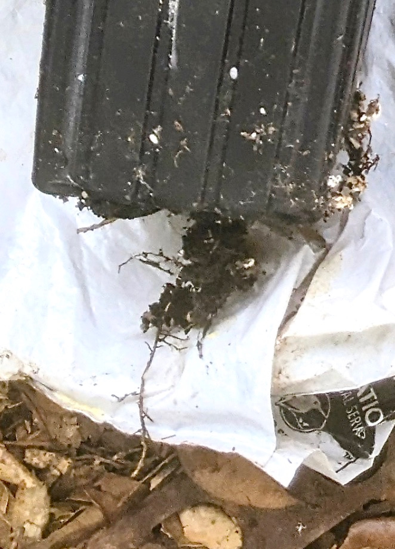 RIGHT: Although the evergreen leaves (not visible) of the above-ground growth look healthy, the root system, even after 5 years in its germination pot, show an utter lack of root hairs and bottoming-out of the taproot.