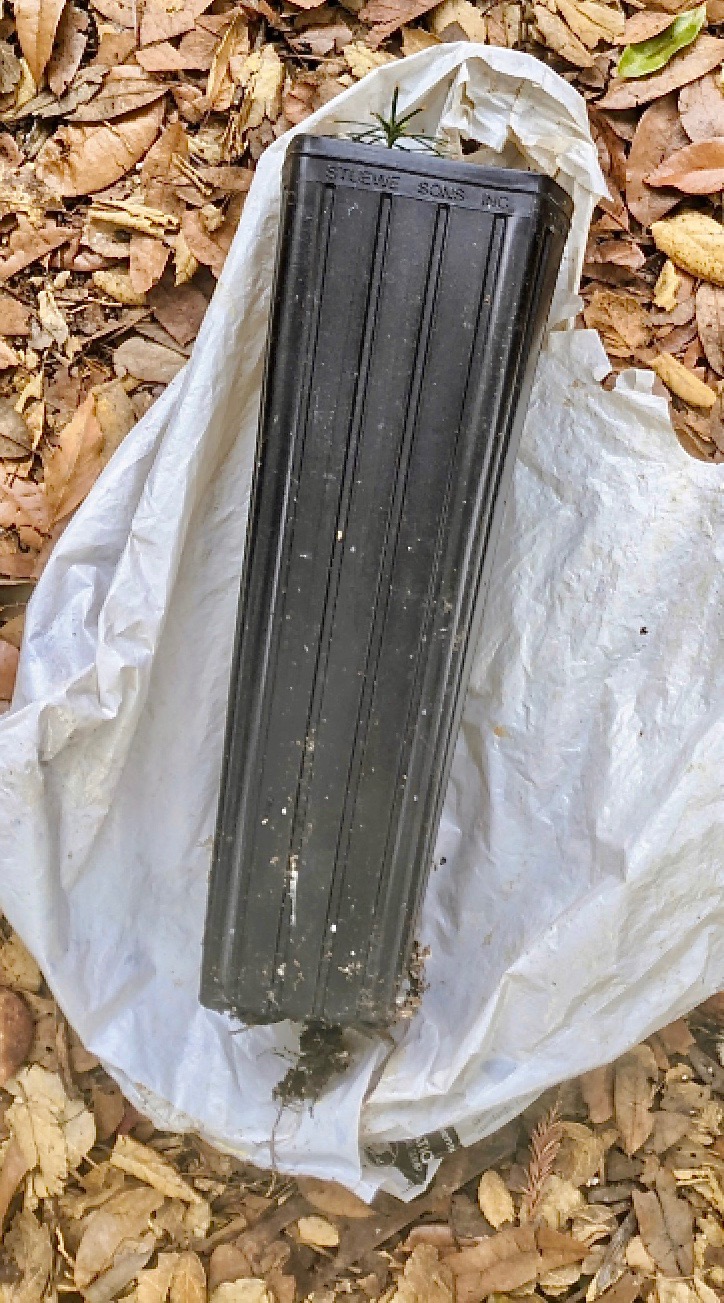 PHOTOS BELOW: Lamar Marshall aimed for FULL-SUN ORCHARD STYLE placement of his seeds directly into his area of mowed lawn. He chose Bio-Tone Starter Plus to ensure that his mixture of top soil, sterile potting soil, leaf litter, and a pinch of lime will offered the torreya seedlings ready-to-go spores of ENDO mychorrizal fungal symbionts.