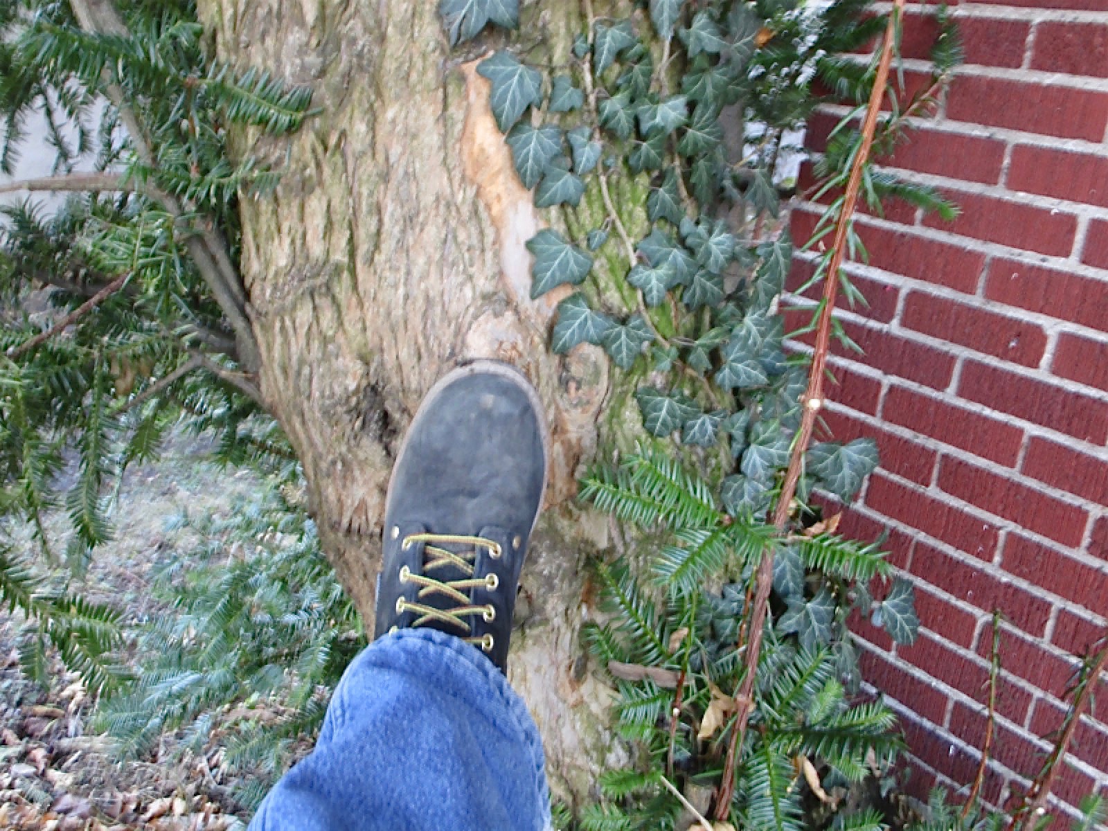 ABOVE LEFT: hickory trunk in front of evergreen magnolia canopy, with trunk of American Beech at center.