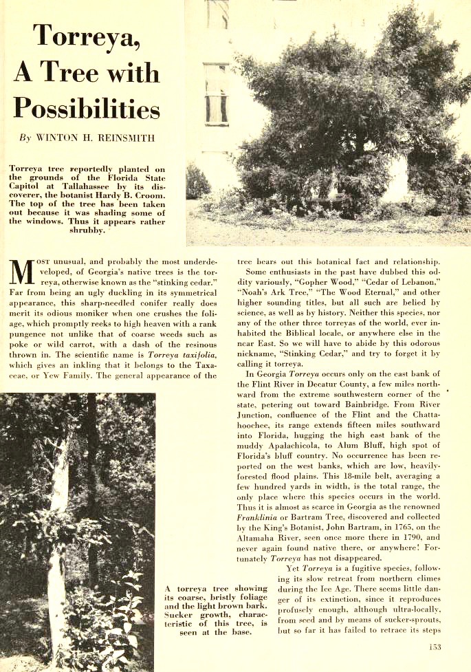 "...Trees, which are usually of importance to man or sufficiently conspicuous to attract his attention, obtain naturally local vernacular names before science imposes others on them, and the common names once engrafted on a language, almost always hold their own among the people of the country where the trees are found. It was a matter, therefore, of much interest and some surprise to hear recently, in western Florida, the Torreya taxifolia, one of the rarest of all our trees, spoken of generally as the 'Torrey-tree'; and to find that Stinking Cedar, the unattractive name by which this tree was first known to the inhabitants of western Florida, was gradually being replaced by that of one of the Nestors of American botany.