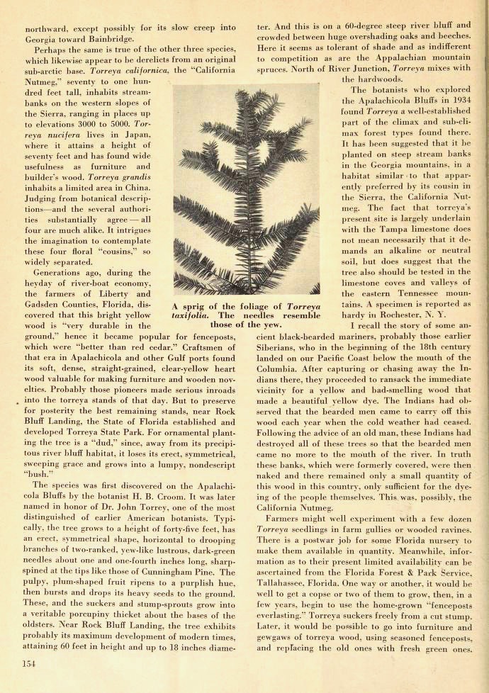 "The largest [Torreya] tree I saw grew near the bottom of a deep ravine; its trunk just above the base measured almost four feet in circumference, and was proportionally tall. But it was dominated by the noblest Magnolia grandiflora I ever set eyes on, with trunk seven and a half feet in girth.... Seedlings and young trees are not uncommon, and some old stumps were sprouting from the base, in the manner of the California Redwood...."