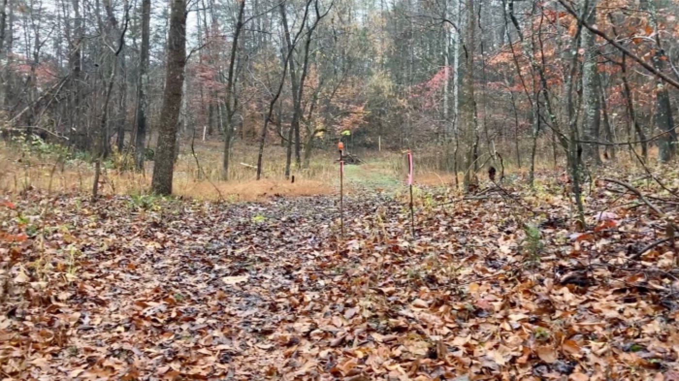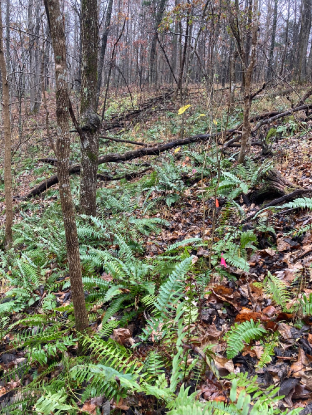 PHOTOS ABOVE: The first 10 seeds were planted amidst this large cluster of Christmas ferns on 11 November 2020. Orange flags mark the planting sites of the seeds from Clinton NC. Pink flags mark the seeds harvested at Mt Olive NC. Total planting in this site was 5 seeds from each source.