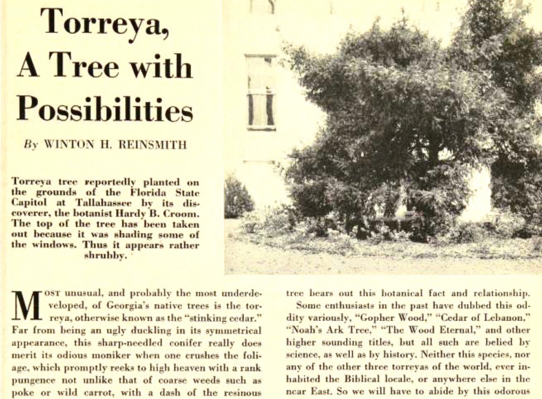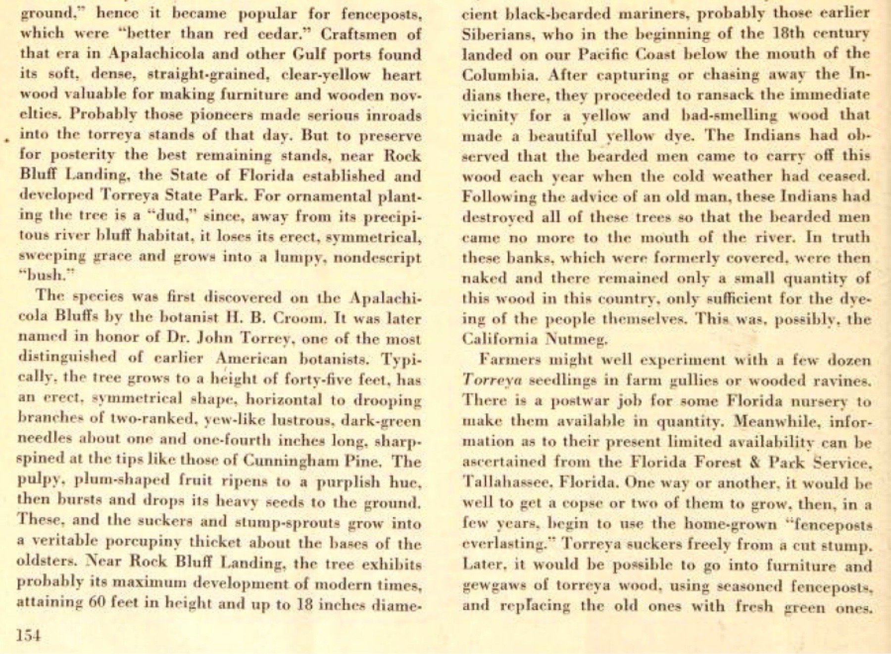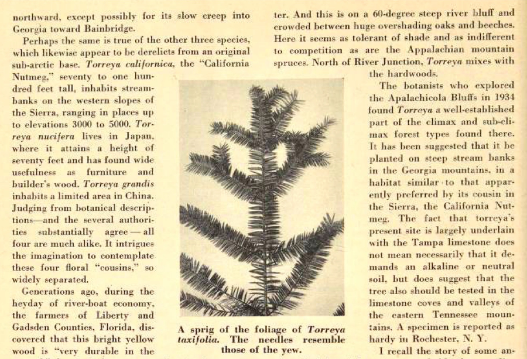 In 2026 Paul Camire, a Torreya Guardian in Michigan, discovered this archived article online. Expanded images of the article are shown at bottom. But first, I excerpt almost all of the article and add bold (and color) to draw attention to key points. Much of the excerpted text also appears on these additional pages on the Torreya Guardians website, as it offers crucial historical, cultural, and ecological understandings of this endangered tree that are not available in any academic publications:Reports by Volunteers • Natural History of Florida Torreya • Learnings EXCERPT: ... In Georgia Torreya occurs only on the east bank of the Flint River in Decatur County, a few miles northward from the extreme southwestern corner of the state, petering out toward Bainbridge. From River Junction, confluence of the Flint and the Chattahoochee [the Woodruff Dam was constructed at the confluence in 1956], its range extends fifteen miles southward into Florida, hugging the high east bank of the muddy Apalachicola, to Alum Bluff, high spot of Florida's bluff country. No occurence has been reported on the west banks, which are low, heavily-forested flood plains. This 18-mile belt, averaging a few hundred yards in width, is the total range, the only place where this species occurs in the world. Thus it is almost as scarce in Georgia as the renowned Franklinia or Bartram Tree, discovered and collected by the King's Botanist, John Bartram, in 1765, on the Altamaha River, seen once more there in 1790, and never again found native there, or anywhere! Fortunately, Torreya has not disappeared.