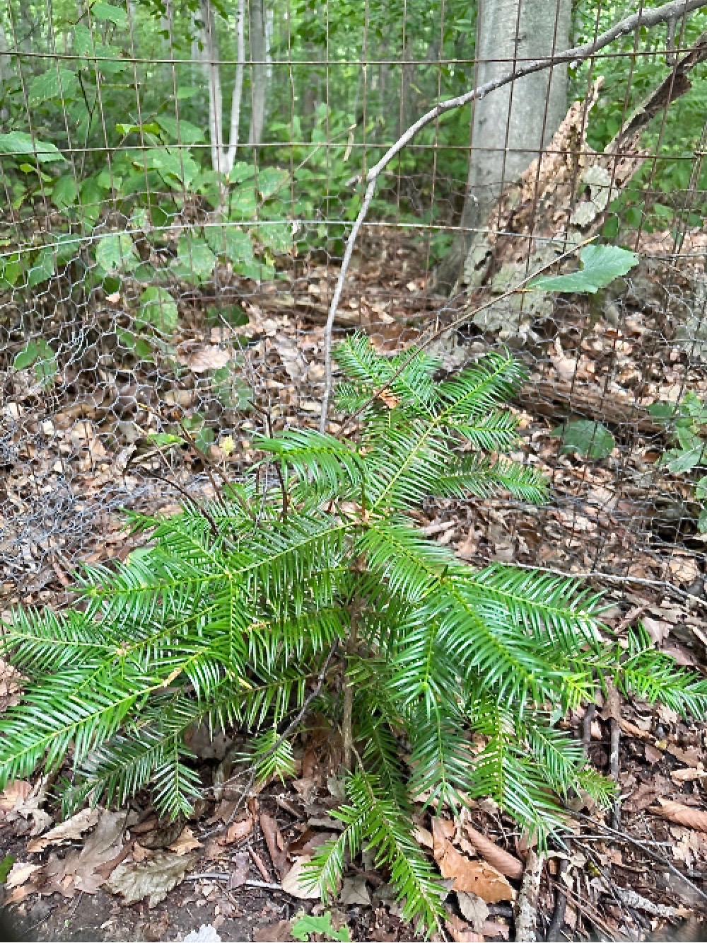 My experiments with herbivory of Torreya are at an end. I had 9 seedlings I bought in spring 2018 and had planted in an area where ash and elm have died back. They were all eaten down that year, but 8 came back. They weren't touched in 2019, but this spring they were eaten back again. Unfortunately, during my check two days ago, only one resprouted. These seedlings are/were growing in the midst of poison ivy, grape, and Virginia creeper in addition to jack-in-the-pulpit, elm/ash/red maple seedlings, and geraniums. I thought this thick layer of underbrush would protect them, but they were still sought out. The herbivory was consistent with previous herbivory done by deer. I even peeled the poison ivy back expecting to see safely protected Torreyas, but it was not enough of a deterrent. So in my area, cages/fencing is a must in early years. I also have to conclude that herbivory in early to mid spring will be lethal to young Torreyas (seedlings) in my area.
