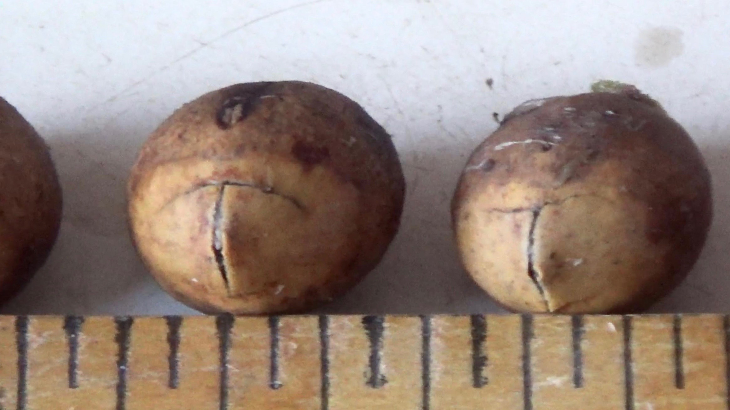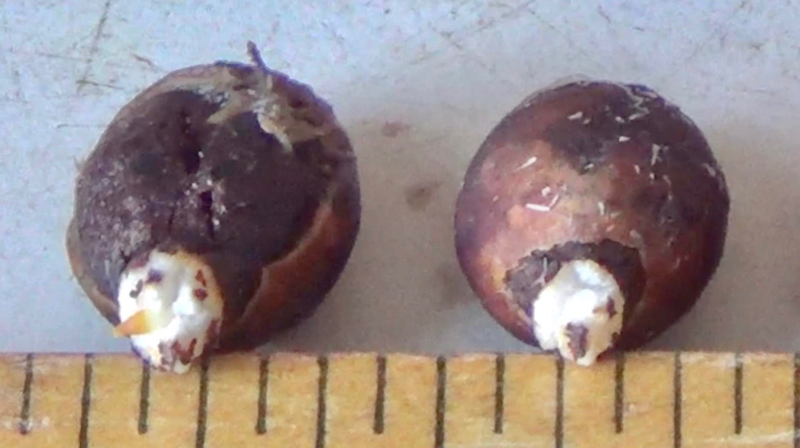 LEFT: This seedling has emerged during its second summer in a rodent-protected germination bed within a semi-shaded forest setting. Before the above-ground growth became visible, the food energy and nutrients stored in the large seed supported growth of a taproot and some lateral roots, while encouraging symbiotic fungal partners to create the root hairs by feeding them food stores, too.