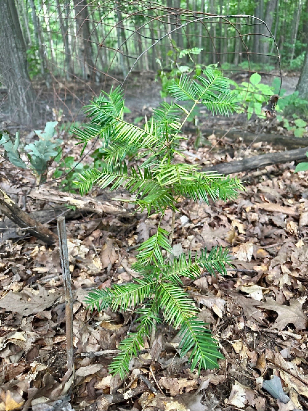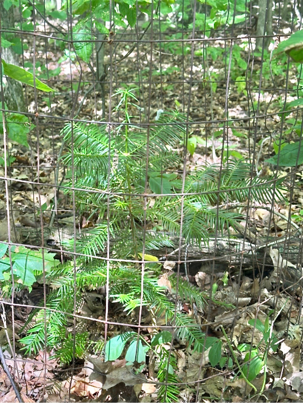 My experiments with herbivory of Torreya are at an end. I had 9 seedlings I bought in spring 2018 and had planted in an area where ash and elm have died back. They were all eaten down that year, but 8 came back. They weren't touched in 2019, but this spring they were eaten back again. Unfortunately, during my check two days ago, only one resprouted. These seedlings are/were growing in the midst of poison ivy, grape, and Virginia creeper in addition to jack-in-the-pulpit, elm/ash/red maple seedlings, and geraniums. I thought this thick layer of underbrush would protect them, but they were still sought out. The herbivory was consistent with previous herbivory done by deer. I even peeled the poison ivy back expecting to see safely protected Torreyas, but it was not enough of a deterrent. So in my area, cages/fencing is a must in early years. I also have to conclude that herbivory in early to mid spring will be lethal to young Torreyas (seedlings) in my area.