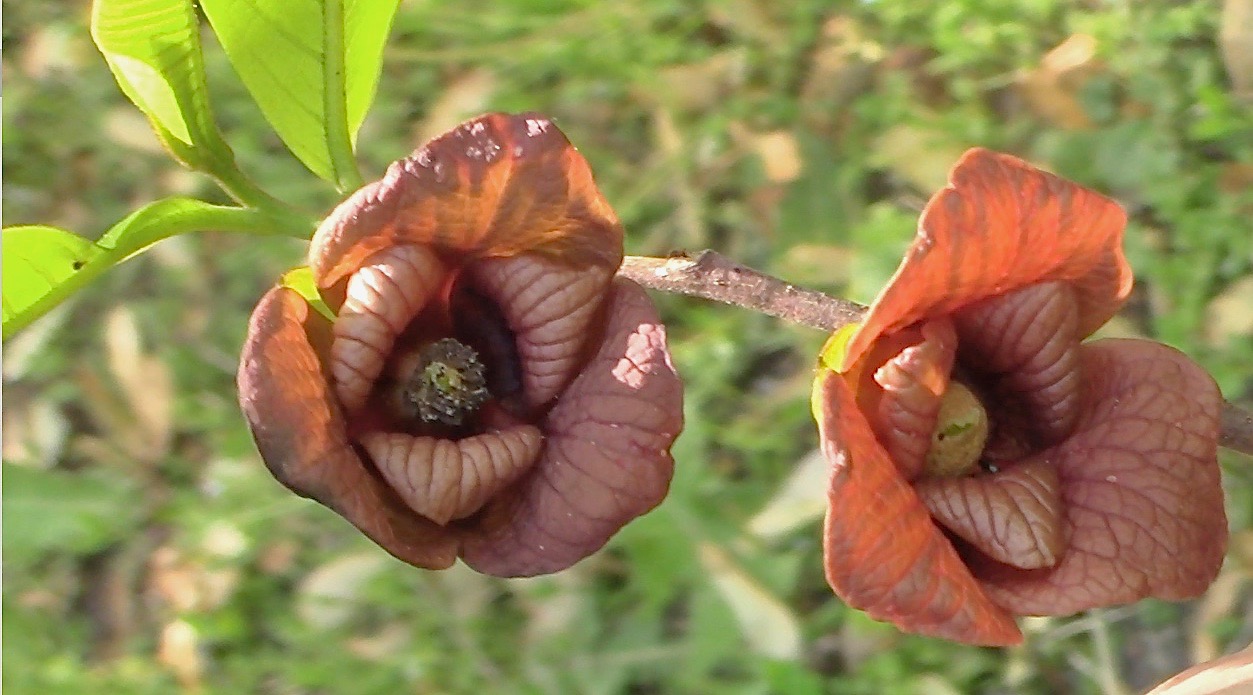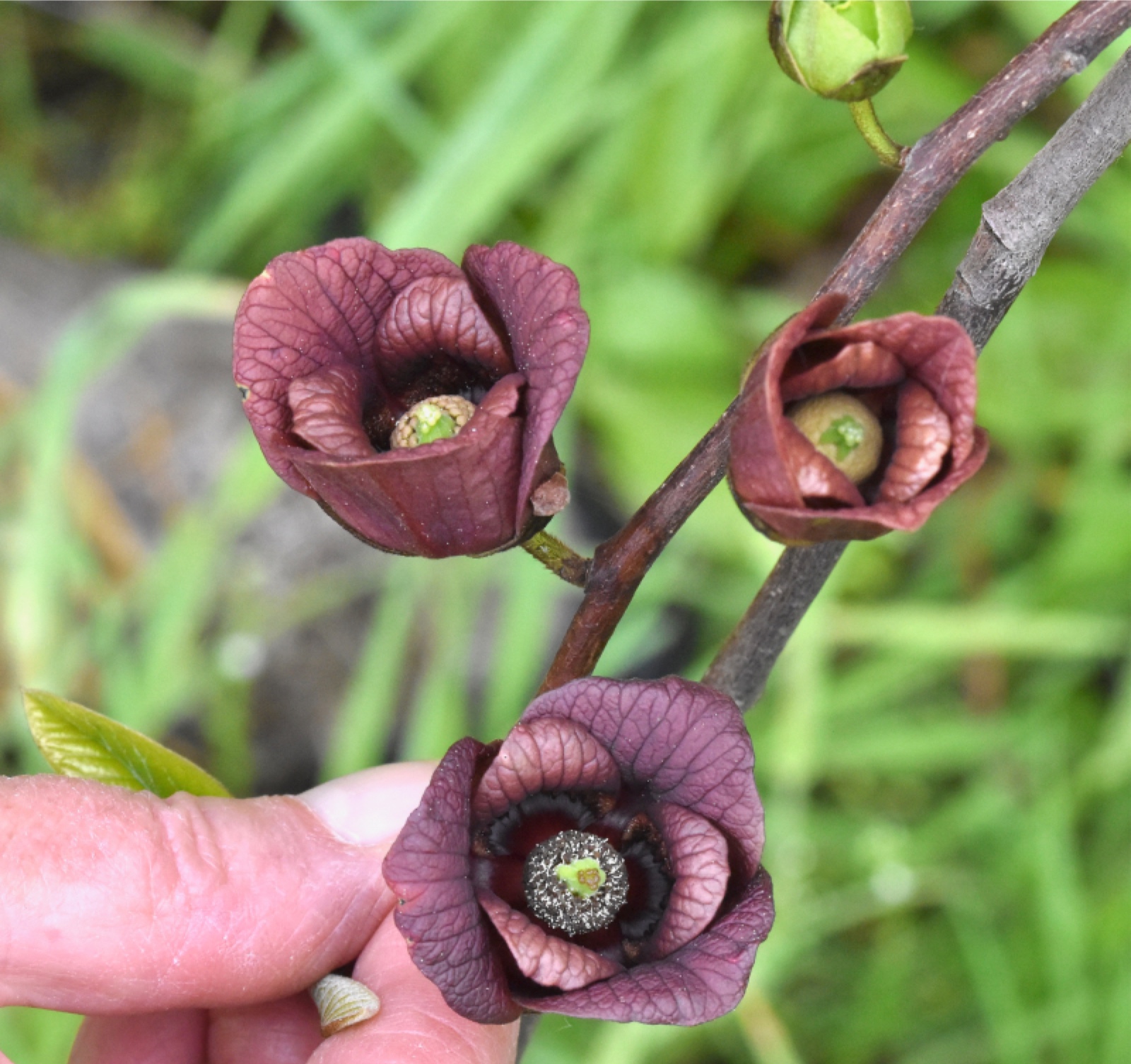 BELOW: Connie collected a low branchlet that had one of the few very open flowers, and that also shows the early leaf stage, which is only at the branch tip. This is the female stage flower. Are the white dots pawpaw pollen? Are the black dots at stigma tips indications of pollination?