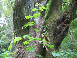 PHOTO 15c, 15d, 15e: The state champion tree is ailing. Although not overtopped or crowded by any other tree, its canopy is not nearly as full as that of the second-largest Torreya, and it has large debarked sections. (Fruitless, it seems to be a male.) Photo 15c shows where the tree is curling a fold of living wood and bark over a previous wound (which is the large white patch in Photo 15a toward the left side of the trunk on a plane with Connie's hand). But notice how in 15d a new crack has opened in that very fold, and is thus vulnerable to fungal spore entry. Photo 15e shows where the trunk divides into two or more stems, about 15 feet above ground level. We (and Jim West) could not discern whether this fork represented a divide in a single original stem or whether two stems eventually grew together. Notice the dense moss on the trunk, which carpets the "top" side of the leaning trunk. One would expect intense acidification of the upslope roots, where rainwater percolating down the mossy expanse meets soil. Indeed, Connie felt around the base of the two structural roots on the upslope side, where each plunged into the soil, and she was alarmed to discover that one of the two was already severely compromised: big chunks of moss-covered wood pulled off with barely a touch. Lee Klinger believes that the same techniques (liming) that he has used to HEAL big oak trees suffering from "sudden oak death" can be used to heal and safeguard this champion tree.UPDATES ON THE FATE OF THE ABOVE SWANTON CHAMPION TREE: