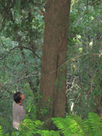 PHOTO 15a & 15b: Connie with the STATE CHAMPION CALIFORNIA TORREYA! Because Torreya californica is native only to California, this tree is also the largest California Torreya on the planet. We measured its circumference at breast height as 254 inches, which is close to that reported on the internet in the "California Register of Big Trees" and dated as having been measured in 1993 (251 inches). Although this champion tree is listed as 96 feet tall, it did not appear to us to be as tall as the second-widest tree we visited. Lee visually estimated the height of this one (Photo 15b) as only 60 feet.