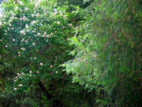 PHOTO 14a & 14b: Road-edge vegetation along the Swanton Road, the only road heading up the narrow valley of Scotts Creek. The road is built on a flat river terrace at this section, which ends where the right-side vegetation begins, as that is the base of a steep slope. The small flowering tree is a California Buckeye, and right next to it is a thriving Torreya (close view of both in Photo 14b). This association refutes (at least in this foggy, coast-range valley) Connie's previous hypothesis (based on her Sierra experiences with Torreya) that Torreya always is found at elevations higher than where one finds California Buckeye. Nonetheless, her hypothesis that Torreya seedlings, saplings, and larger trees will not be found in places where there are abundant young Douglas Fir seems to have held up well in the Coast Range, as well as in the Sierras. Seedlings and resprouting Torreya may, however, be found in association with old, upper-canopy Douglas Fir, as well as growing near tall redwoods, oaks, bay laurels, and pines. Like most other trees, Torreya loves full sunlight, but rarely can it expect to get it in the wild except for post-fire and tree fall episodes or thanks to slumping and eroding steep slopes.