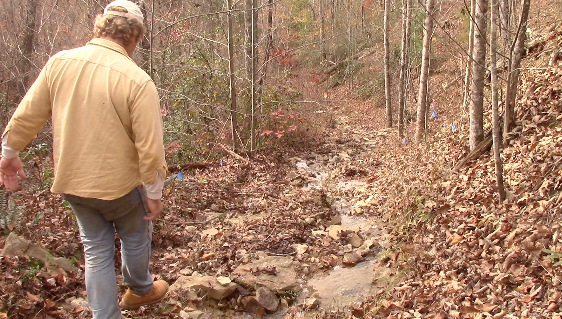 We began our site visit on the plateau upland. While there are some pine-rcih sections, the canopy is almost entirely deciduous. The inventory of species he has planted include: ADD SPECIES and numbers.