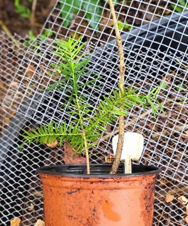 I have good news from Greasy Creek. As you know, there was only one seed from the 5 we were gifted from the Dorman torreya collection in Louisiana (November 2018 site visit). I had the good fortune, and awesome responsibility, of being the holder of that single seedling. It is doing well, still in its pot behind an impassable fence wire barrier. This year the tree has put up a basal sprout. I plan to leave it on the parent until next fall and then collect it for rooting. My sense is that it is yet too small for collection this year. This, being the rarest among our collection from various seed sources, will be dealt with very cautiously.